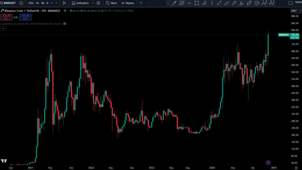 Za posledných 24 hodín vzrástla cena BNB o viac ako 22 %, čím dosiahla rekordných $793 na CoinMarketCap. Tento strmý nárast priniesol celoročné zisky BNB na takmer 200 %.